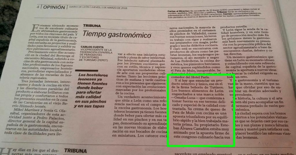 Los comensales pudieron disfrutar de nuestro AOVE variedad Cornicabra, la crema de Morcilla del Obispo y de la crema de queso pata de mulo con cecina que parece haber cautivado el exigente paladar de Carlos Cuesta. Nos congratulamos de ello y agradecemos las palabras que para nosotros ha tenido en el artículo de Diario de León.